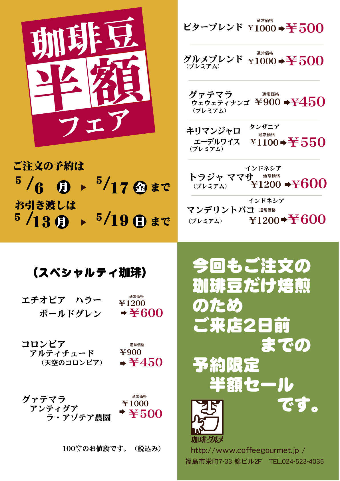 今月の珈琲豆半額セールのお知らせです。 11月10日(月)〜11月21日(金)PM9:00までがご予約期間 11月17日(月)〜11月23日(日)までがお引き渡し期間となります。 商品は予約をしていただき、二日後以降のお…