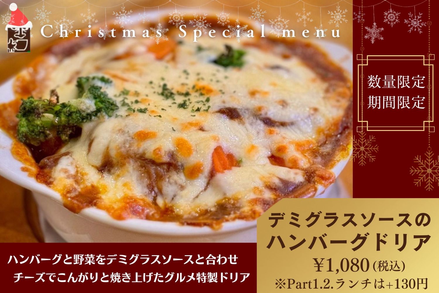 12月の期間限定メニューが2種類登場中! 是非お楽しみ下さい! 熱々のチーズと濃厚なソースが具材を包む 『デミグラスソースのハンバーグドリア』 ピスタチオソフトと色鮮やかなフランボワーズソースを重ねた豪華な 『ミルフィー…