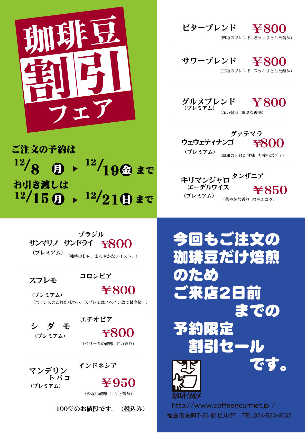 今月の珈琲豆半額セールのお知らせです。 12月8日(木)〜12月19日(金)PM9:00までがご予約期間 12月15日(月)〜12月21日(日)までがお引き渡し期間となります。 商品は予約をしていただき、二日後以降のお引…