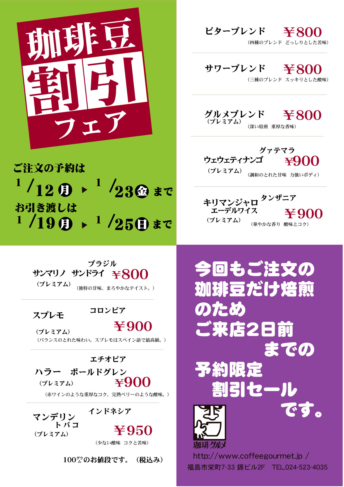 今月の珈琲豆半額セールのお知らせです。 1月12日(月)〜1月23日(金)PM9:00までがご予約期間 1月19日(月)〜1月25日(日)までがお引き渡し期間となります。 商品は予約をしていただき、二日後以降のお引き渡し…