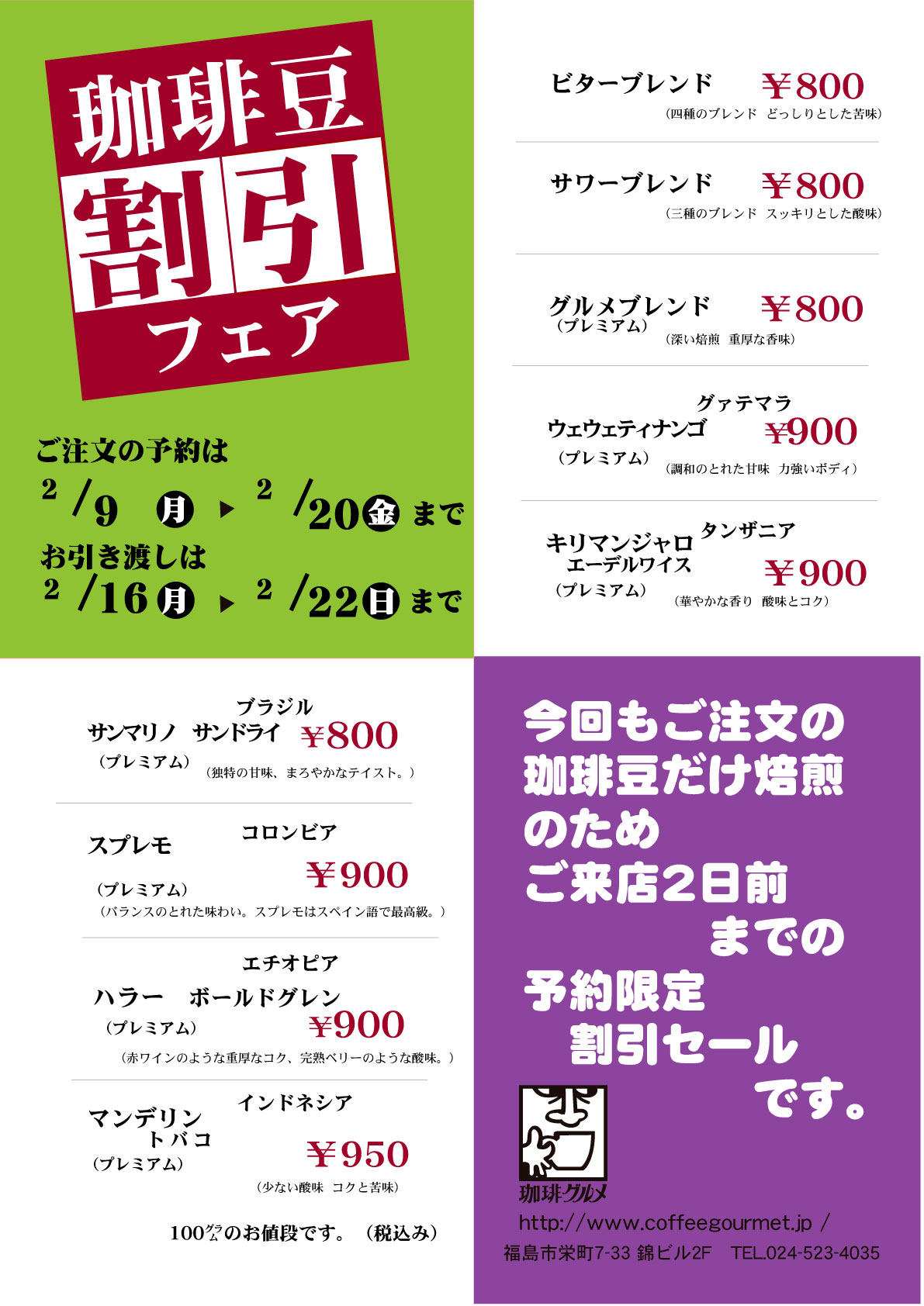 今月の珈琲豆半額セールのお知らせです。 2月9日(木)〜2月20日(金)PM9:00までがご予約期間 2月16日(月)〜2月22日(日)までがお引き渡し期間となります。 商品は予約をしていただき、二日後以降のお引き渡しと…
