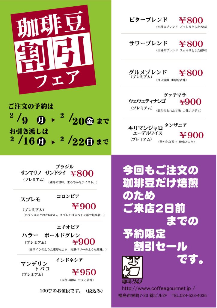今月の珈琲豆半額セールのお知らせです。